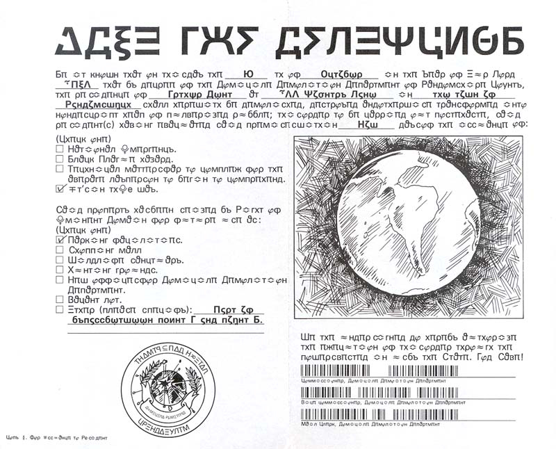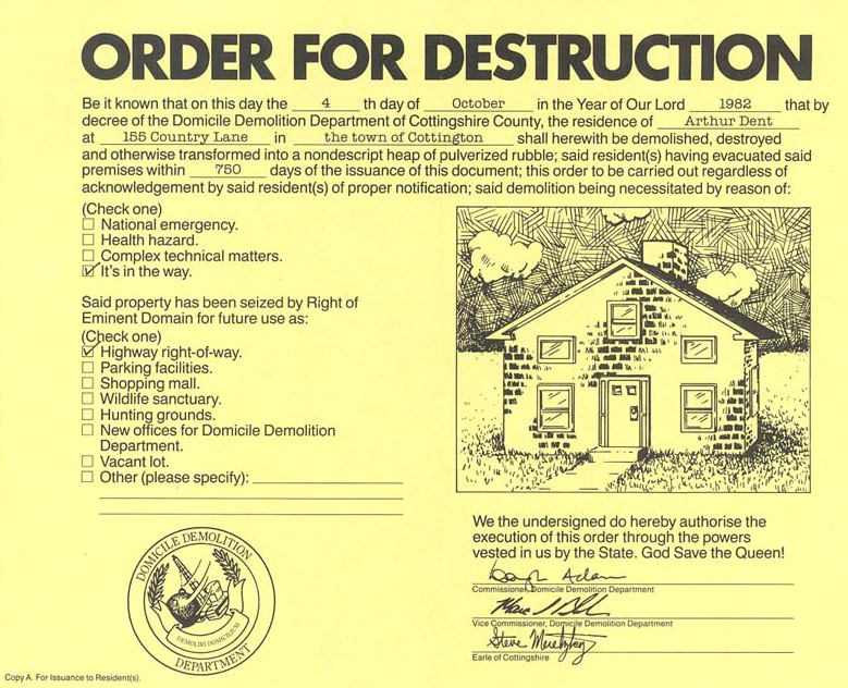 – A ordem da destruição da casa de Arthur Dent escrita em Vogon