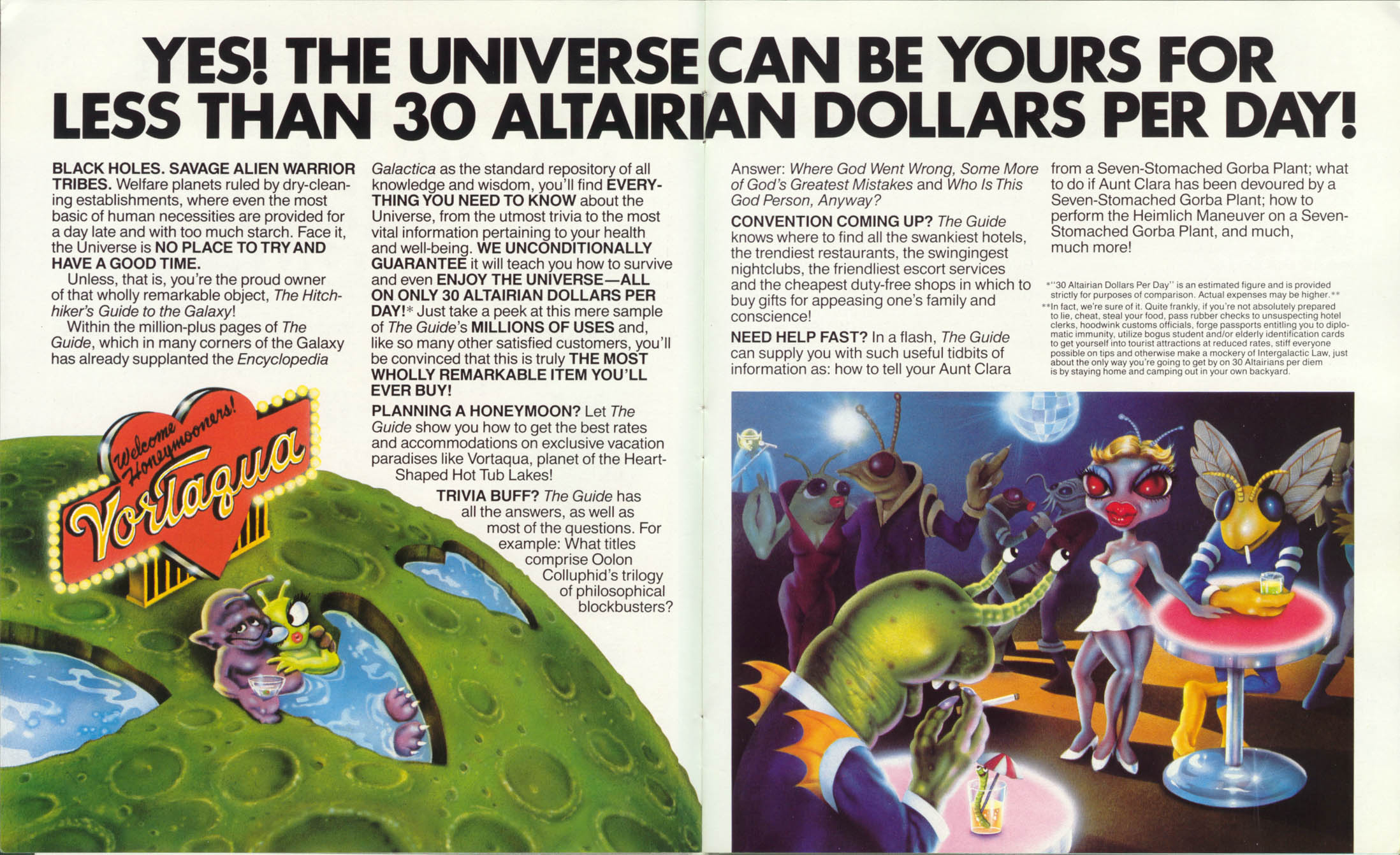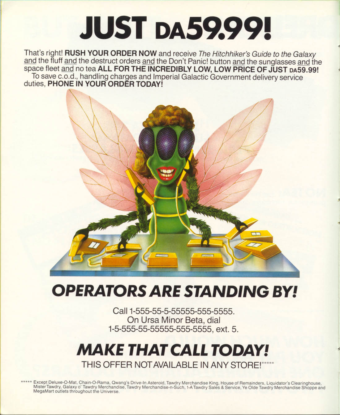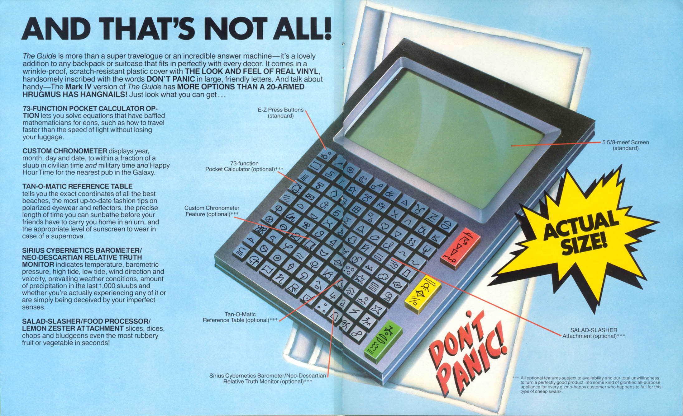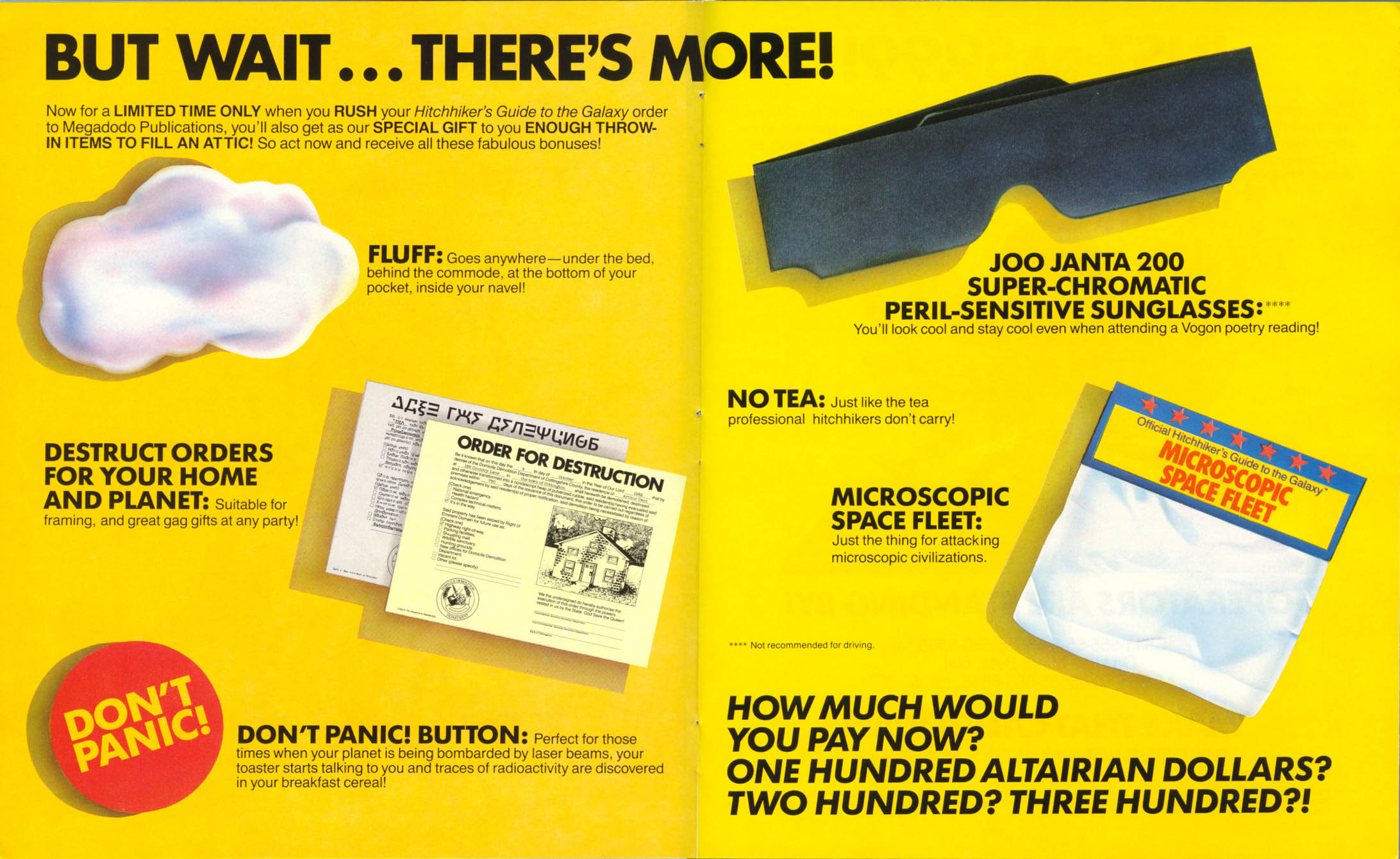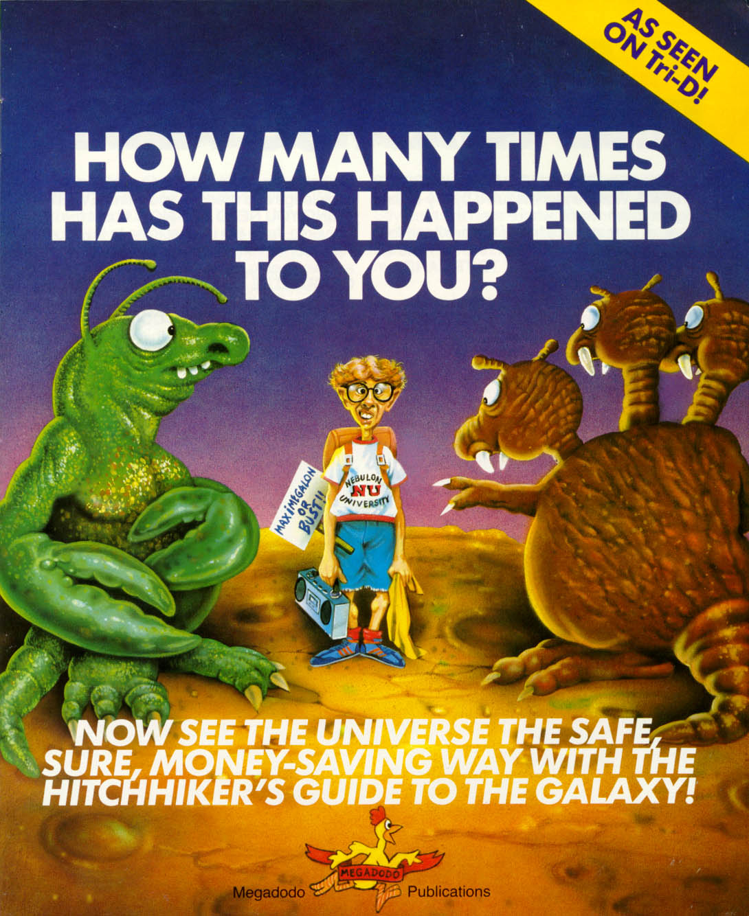 – Um livreto chamado “Quantas vezes isso aconteceu com você?” que na verdade era um folheto fictício para propaganda do Guia do Mochileiro das Galáxias
