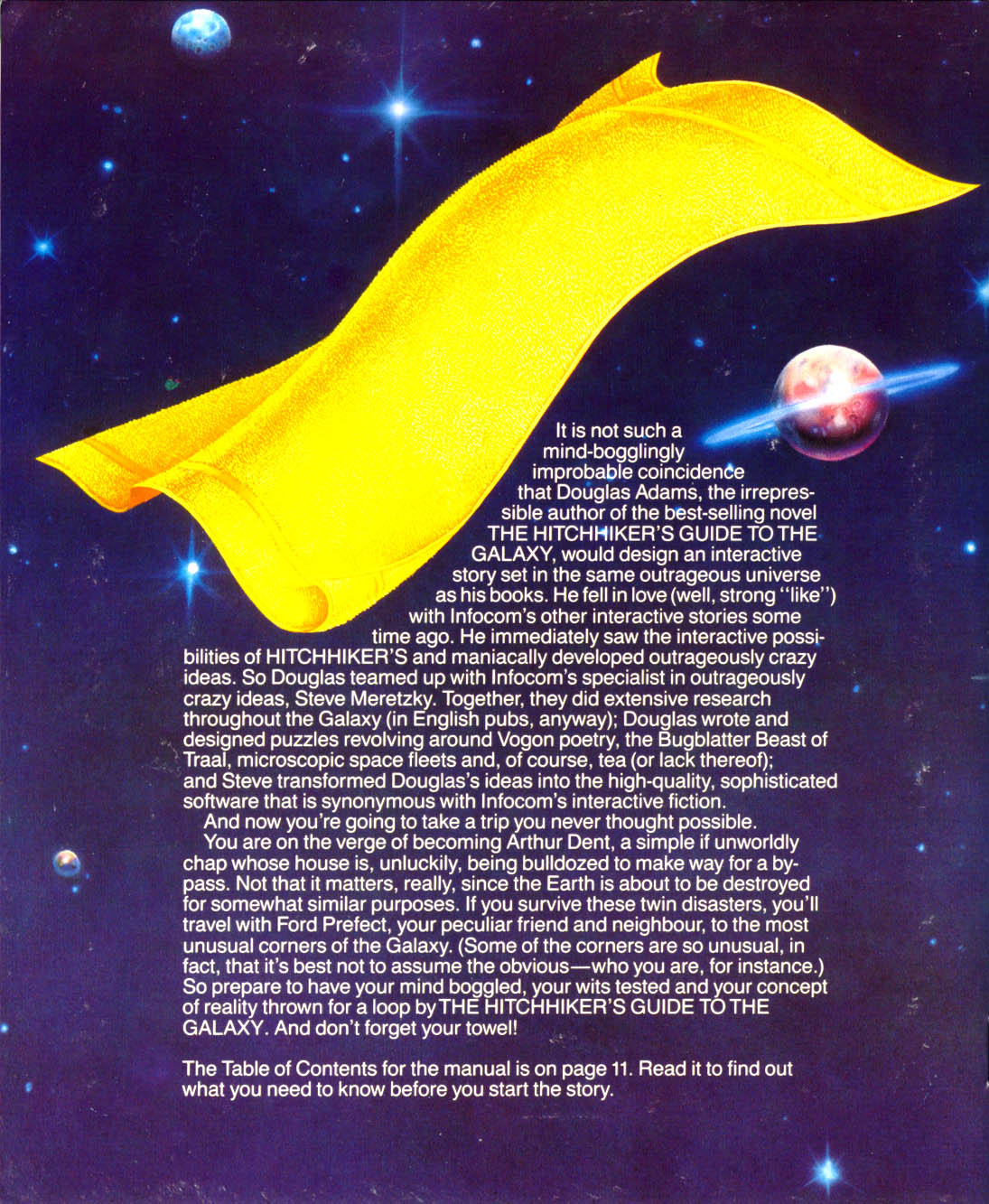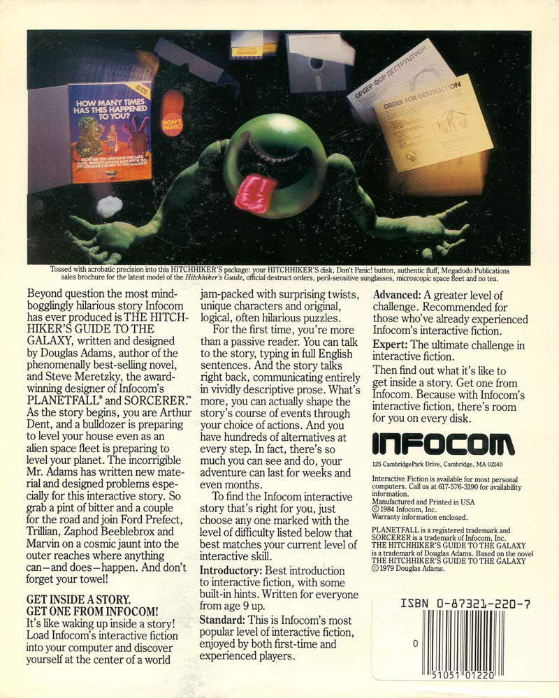 Projetado pelo criador da série, Douglas Adams, e pelo criador da Infocom Steve Meretzky, foi lançado em 1984 (gente eu nem tinha nascido?) para o Apple II, Macintosh, Commodore 64, DOS, Amiga, Atari 8-bit e Atari ST. Foi o 14º jogo da Infocom.