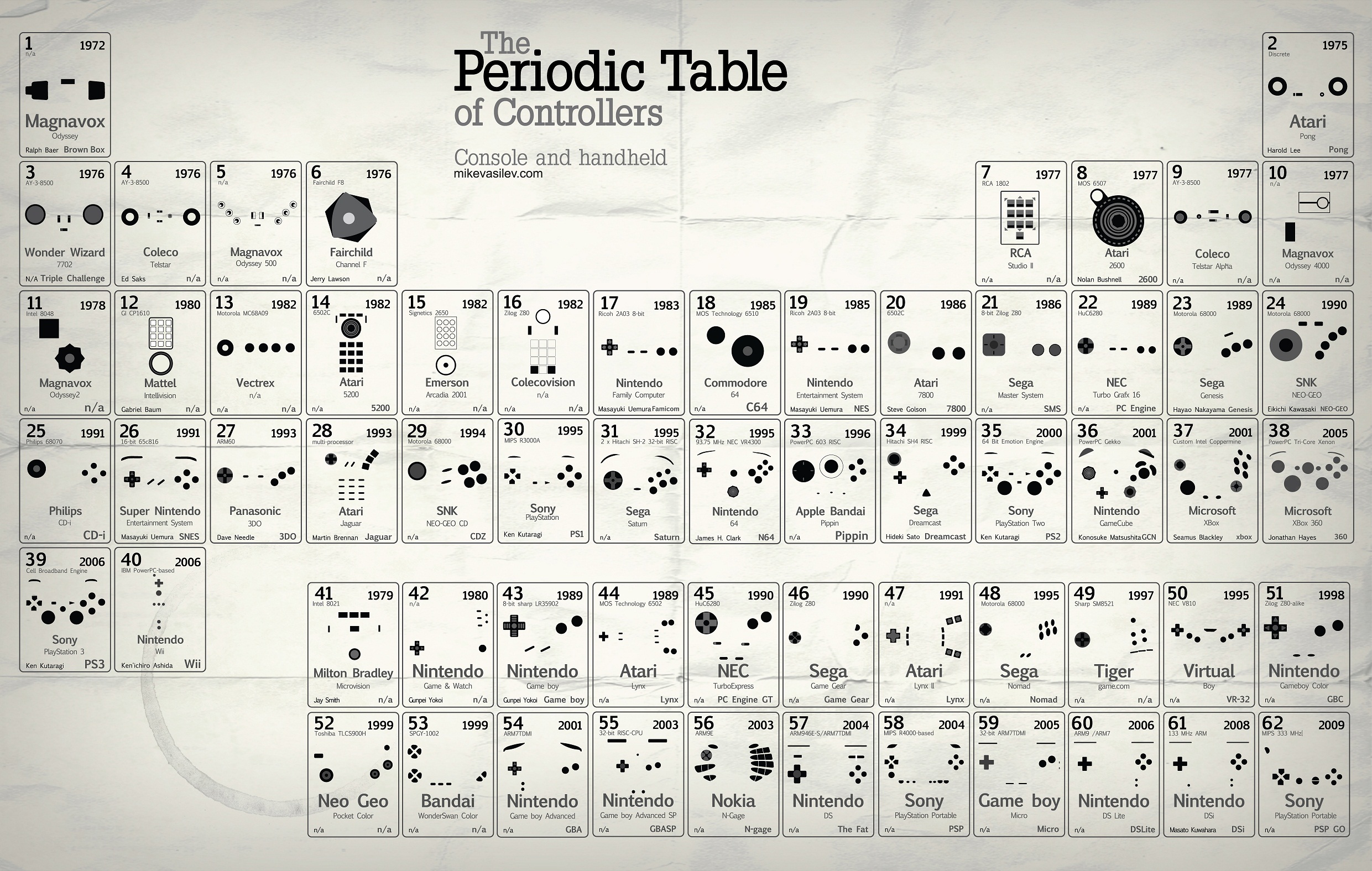 Você conhece  os controles existentes de todos os consoles? A tabela feita pelo artista Mike Vasilev contém uma grande parte ou se não todos os controles de games, e consoles de mão. Classificados por ano de lançamento, e com algumas informações como modelo e fabricante.