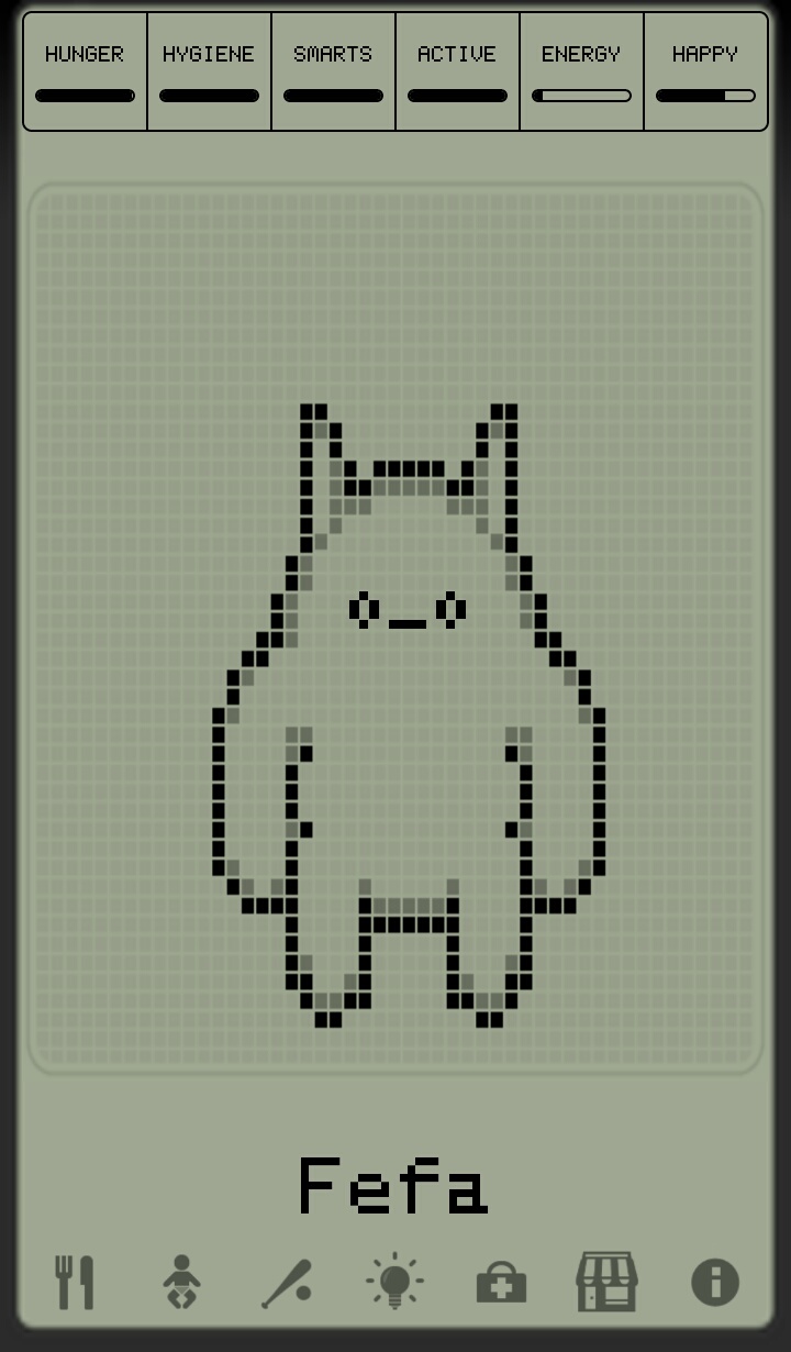Bem parecido com o tamgochi original, principalmente pelo gráfico imitando a tela do original. Agora você compra itens que ajudam ele a crescer e evoluir. Para ganhar moedas e comprar os itens você tem que jogar os mini games ou comprar.