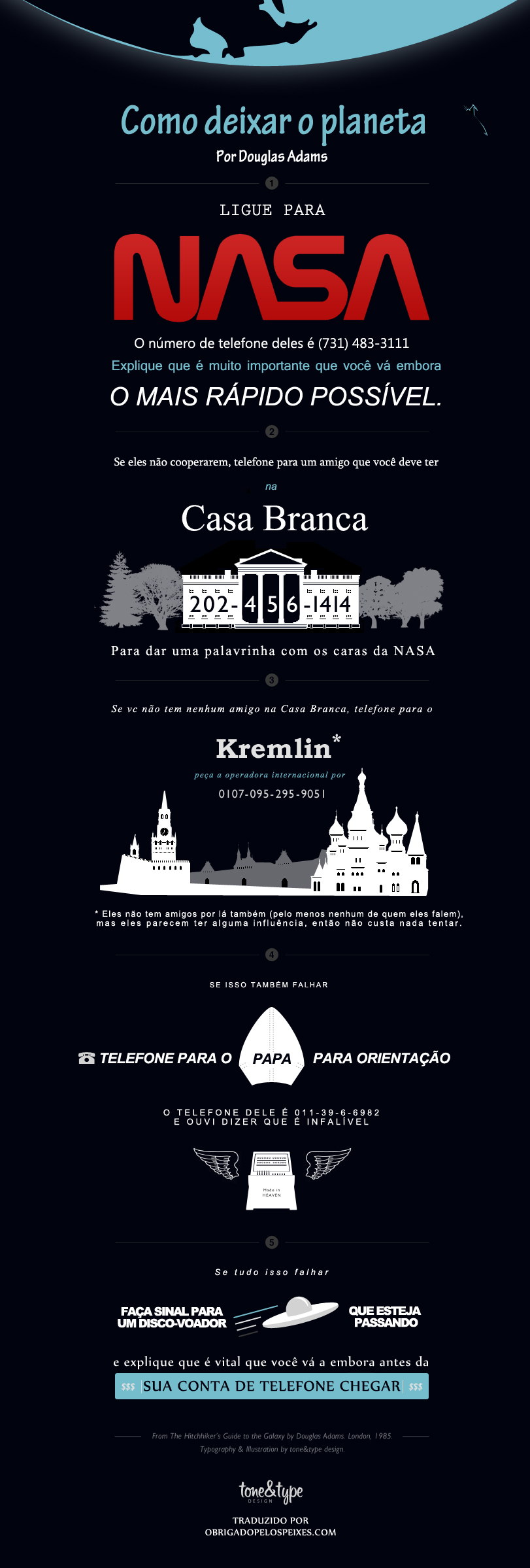 Como não há mais nada que possamos fazer, nosso querido Douglas Adams deixou um Guia prático de Como Deixar o Planeta, e isso foi transformado em infográfico e traduzido gentilmente por nós do OPP.