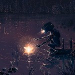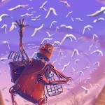 Eu sempre gostei de desenhar cenários, e decidi ter um personagem sozinho pra compor, aos poucos eu fui criando histórias pra ele, mostrar que ele tem sentimentos e é um ser contemplativo com a natureza. Nas ilustrações ele sempre busca algo, geralmente ele olha bem para frente, e uma luz, um objetivo compõe e ajuda a transmitir isso no cenário. Quando comecei a desenhar com nanquim (tinta utilizada principalmente para desenhar mangá) gostava de fazer muitos detalhes, e coisas robóticas têm muitos detalhes, foi assim que meu robozinho surgiu, e aos poucos surgiram mais personagens desse mundo, sempre pensando no que quero passar com a ilustração, como o robô que liberta os pássaros, o que liberta os peixes, os que são invulneráveis à água, o que coleciona trovões, os robôs gigantes, ou micro robô.