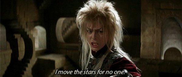 Labirinto, um dos clássicos dos anos 80, e um filme que me diverte e me faz apaixonar toda vez que assisto, é um dos mais lembrados da carreira cinematográfica de Bowie. Totalmente fantasioso, Bowie interpreta Jareth, o rei dos duendes, que sequestra o irmão mais novo de Sarah (Jennifer Connely). Além disso, ele compôs a trilha do filme, e aprende a fazer malabares para o papel. Como não amar?