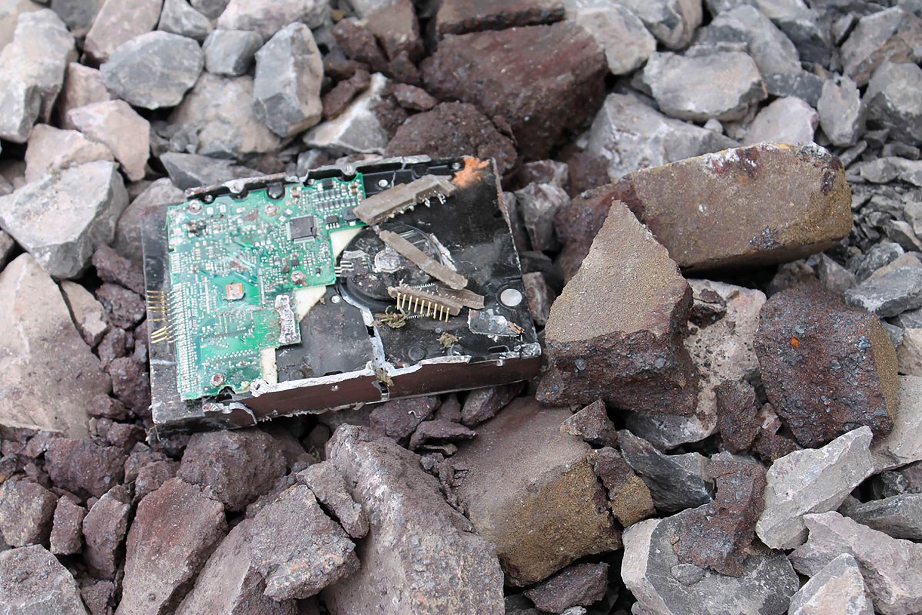 O rolo compressor de seis toneladas e meio, Lord Jericho, passou por cima do disco rígido várias vezes antes de um triturador de concreto terminar de destruir os restos.