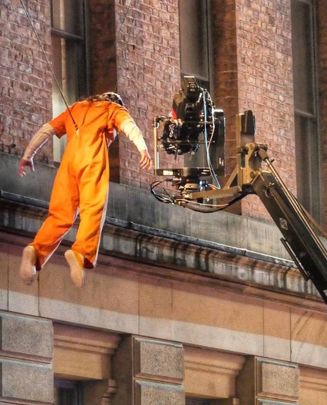 Um dublê de acrobacias também foi visto em um fio de um prédio para aterrissar em cima de uma esteira de impacto em Port Street, onde uma fachada de estação de metrô de Manhattan foi instalada.