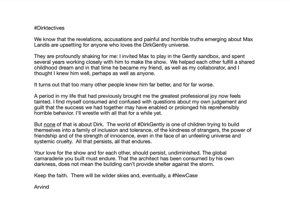 Recentemente, a atriz Fiona Dourif, que interpretou Bart em Dirk Gently postou em sua conta no instagram sobre Max Landis – após algumas postagens declarando que alguém não poderia ser acusado sem provas: