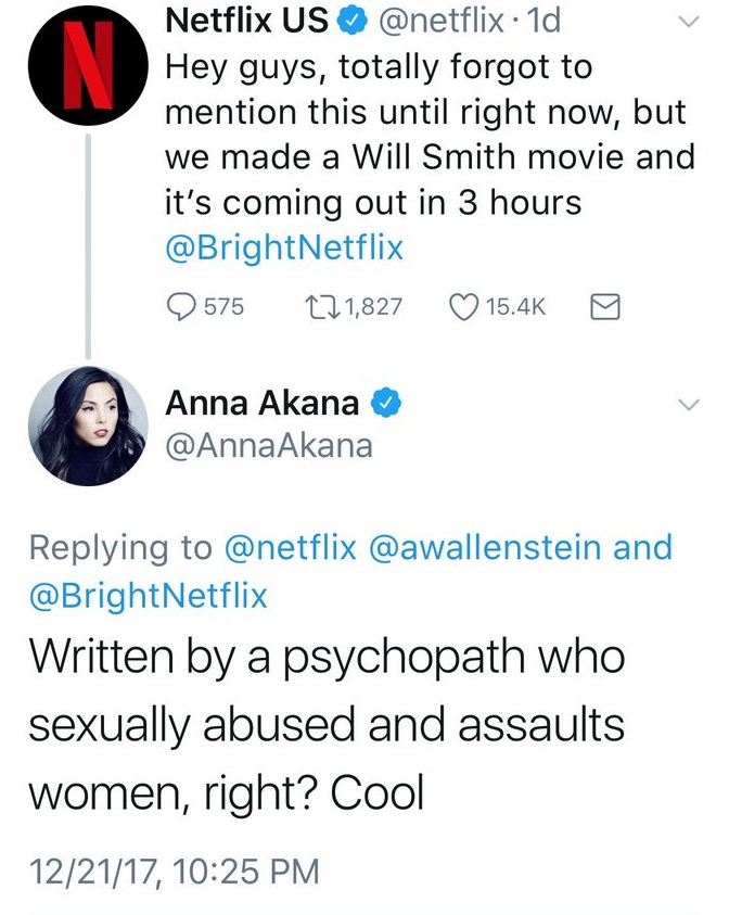 Landis, filho do diretor John Landis, foi acusado pela primeira vez em 2017, quando a atriz Anna Akana, que estrelou um vídeo no YouTube que ele dirigiu, foi ao Twitter no dia em que Bright estreou na Netflix para dizer que o filme foi “escrito por um psicopata que abusou sexualmente e agride mulheres, certo? Legal.”