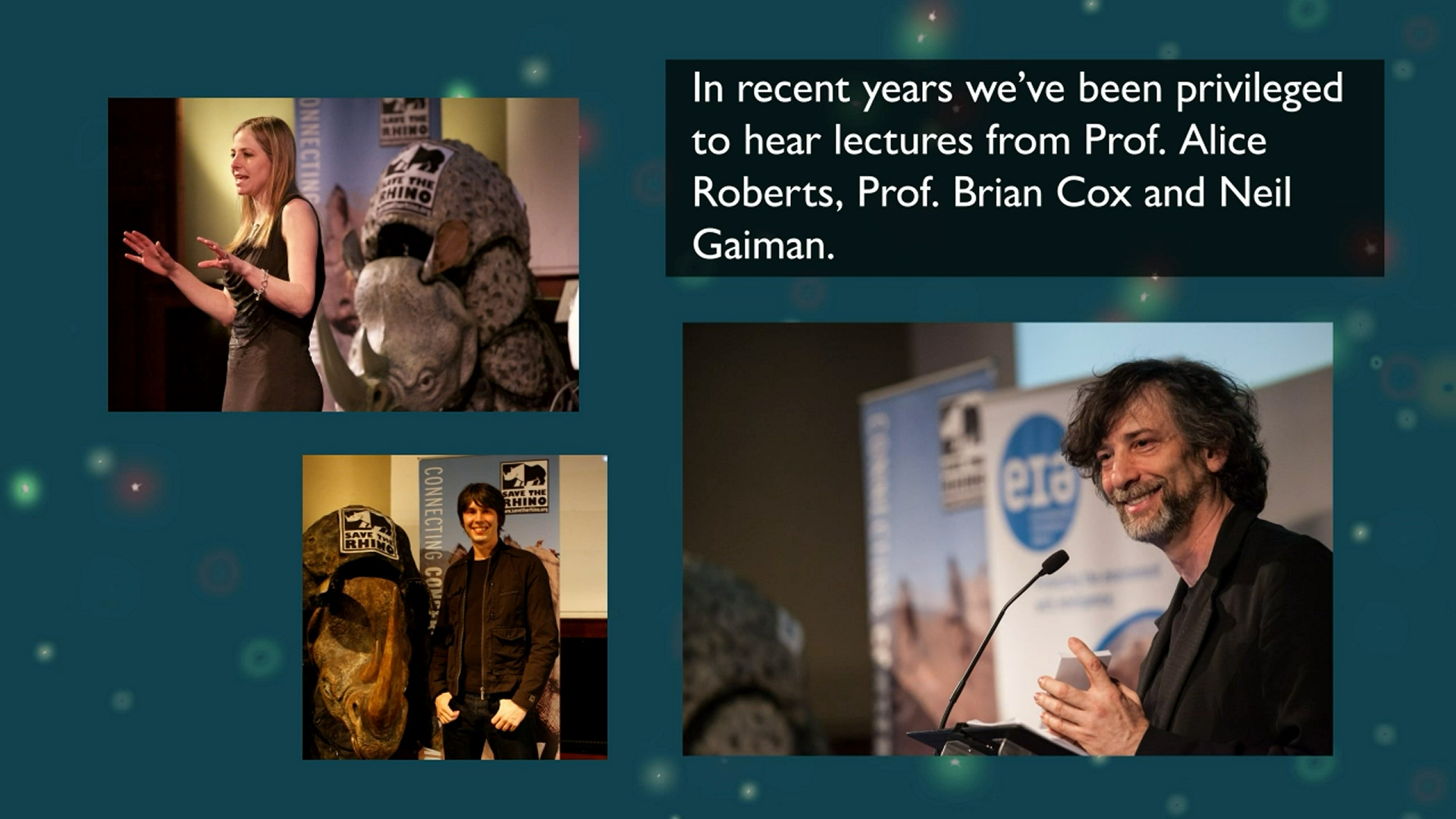 A palestra reúne os fãs de Douglas, compartilha insights sobre muitos tópicos fascinantes com palestrantes brilhantes e arrecada fundos vitais para a conservação dos rinocerontes. Nos últimos anos, o evento teve o privilégio de ouvir palestras de Alice Roberts, Brian Cox, Neil Gaiman e Baronesa Susan Greenfield.